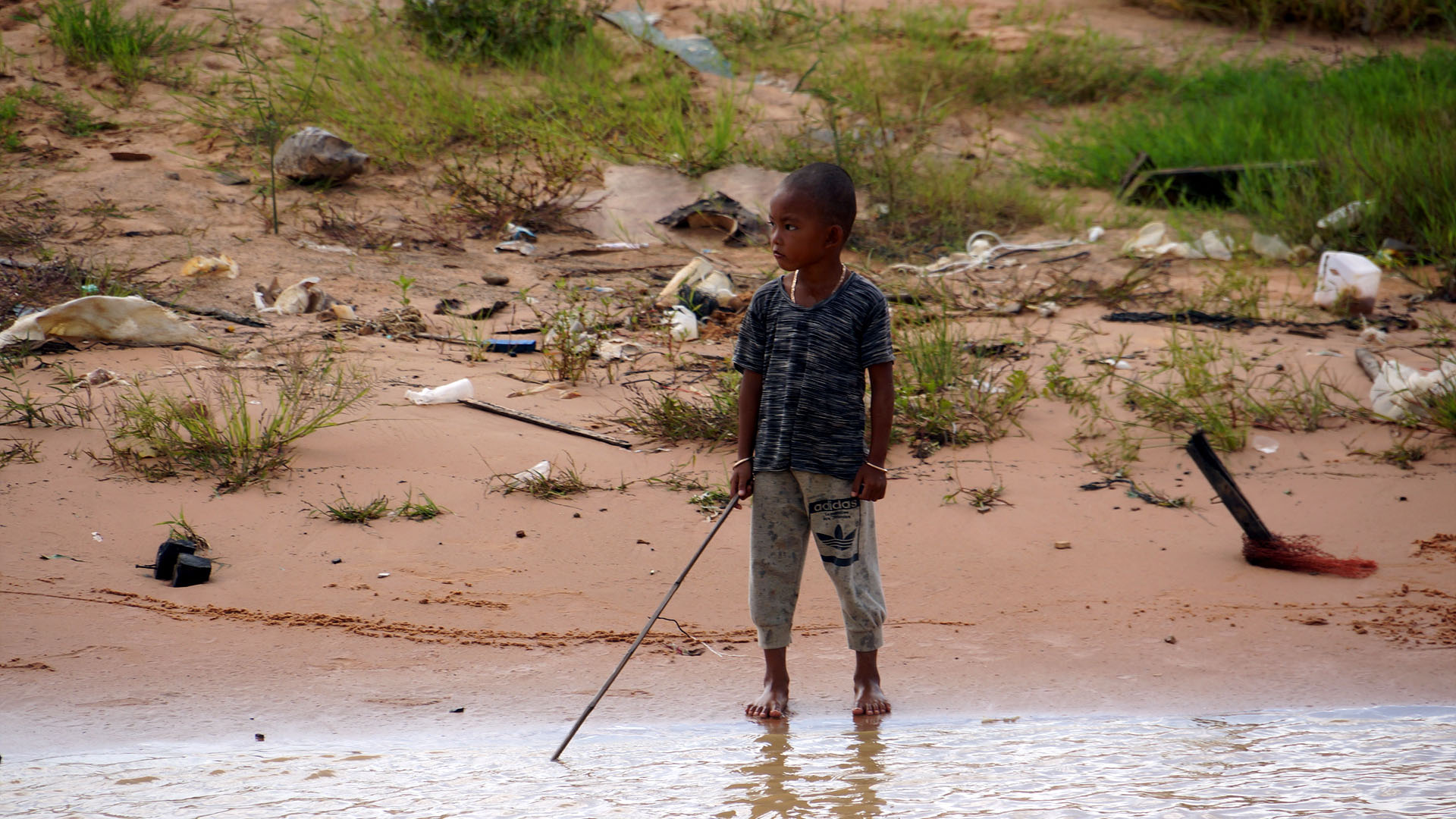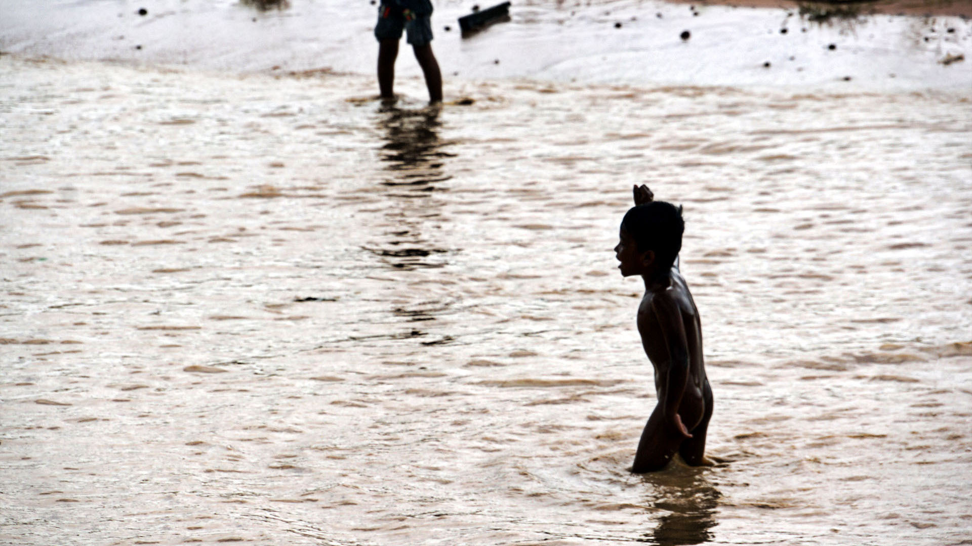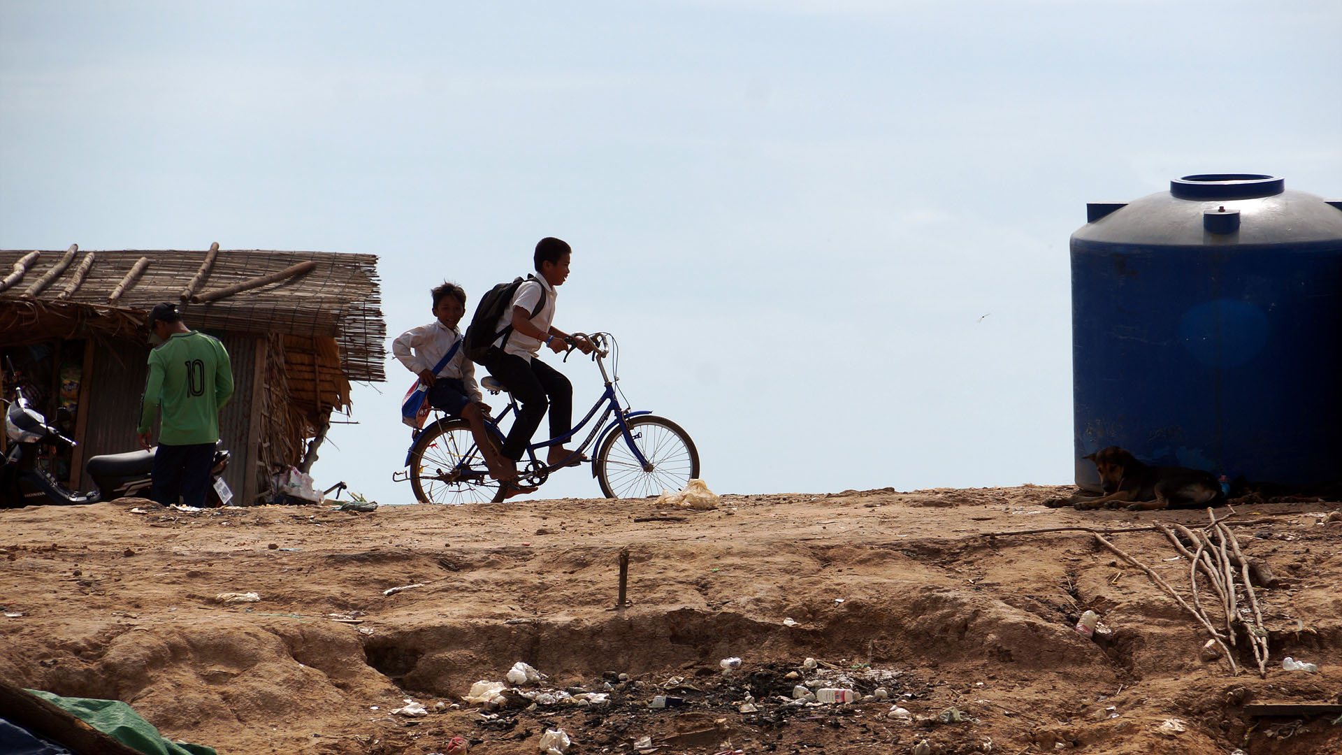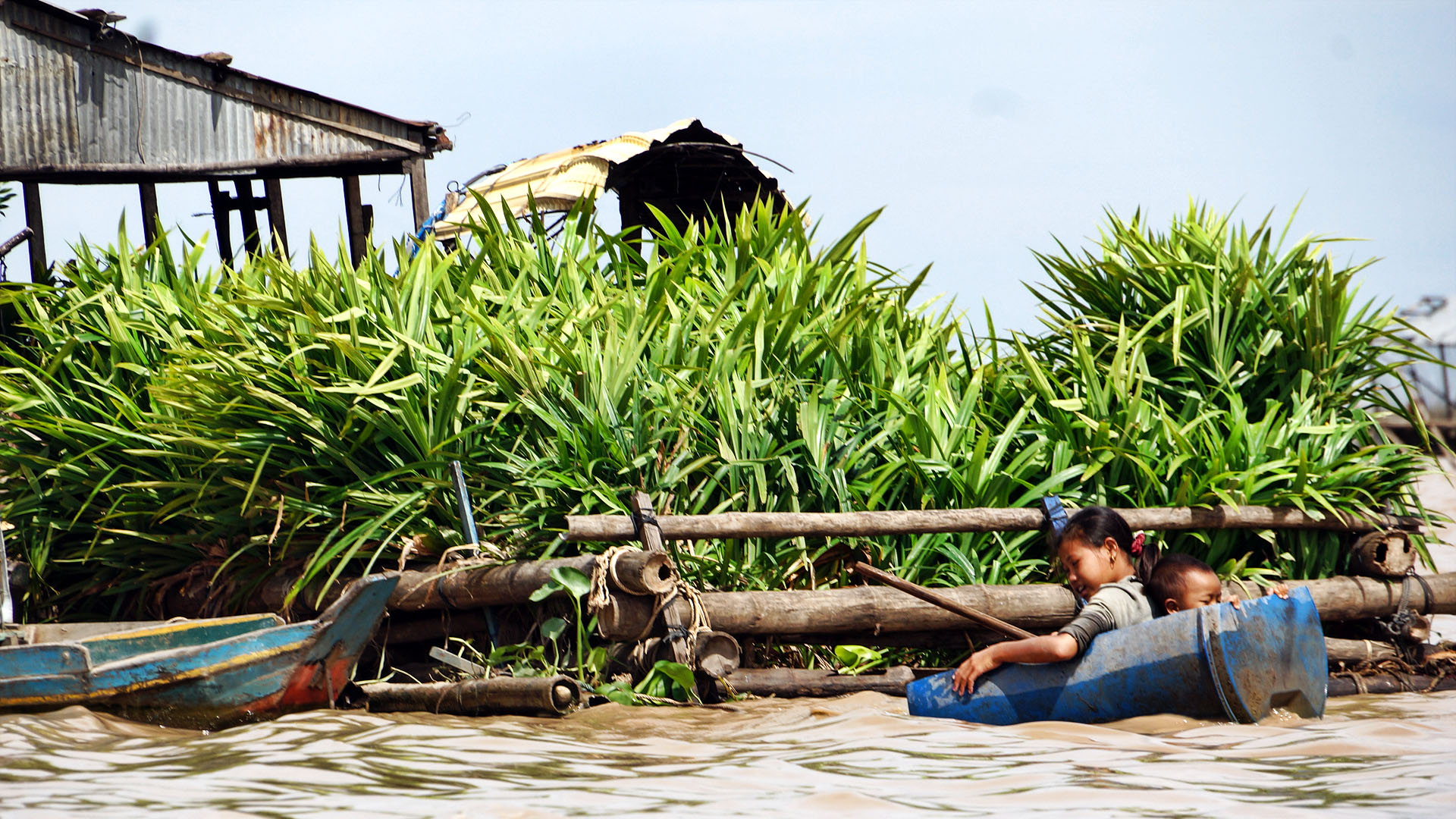플라스틱 물통을 타고 원달라만 달라고 따라오는 아이들...