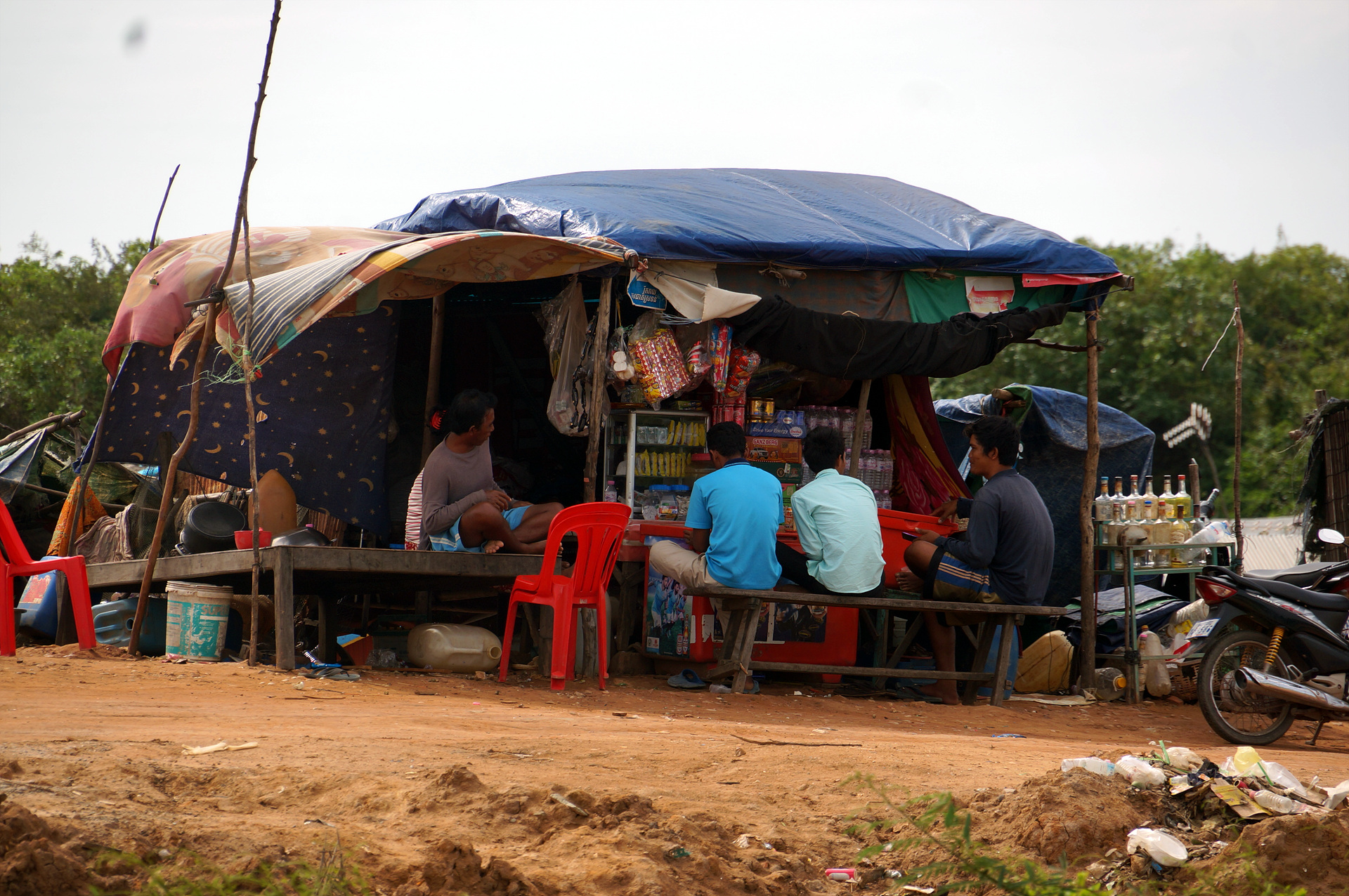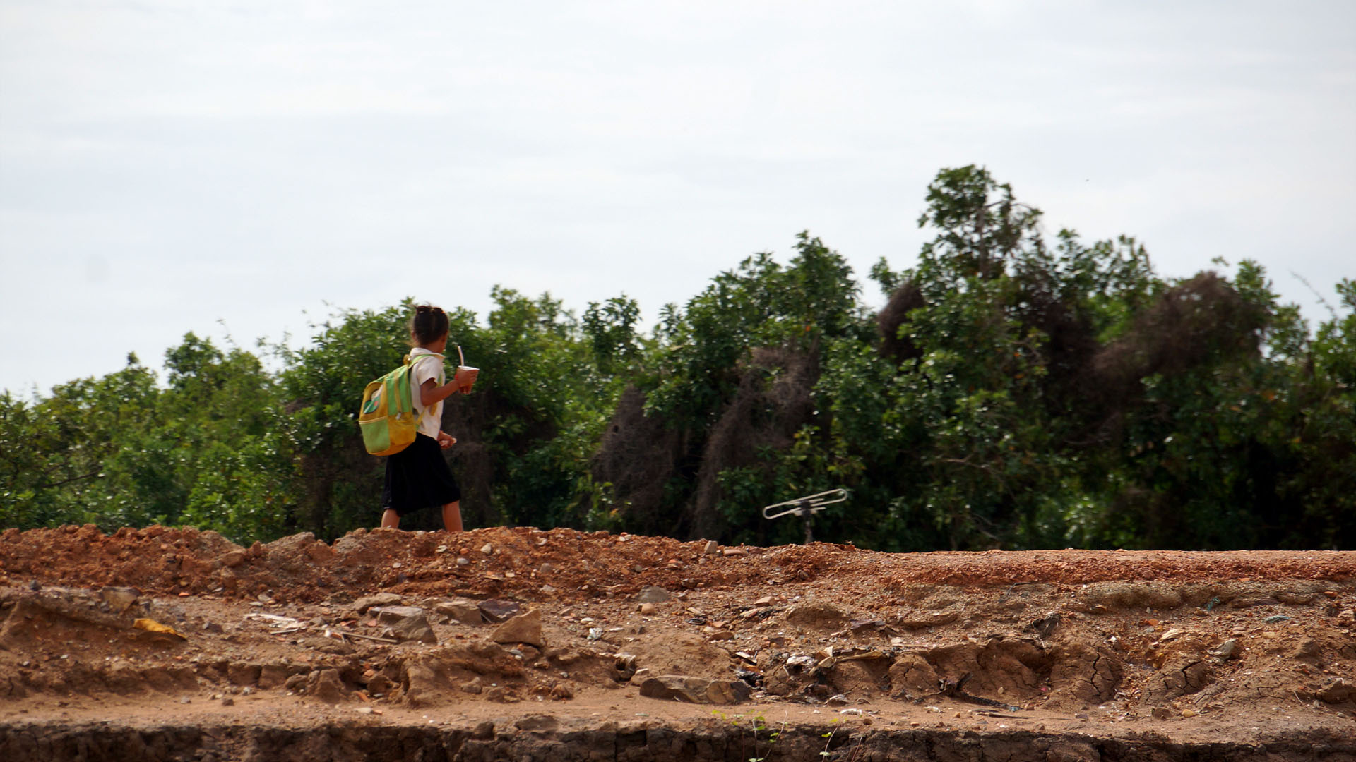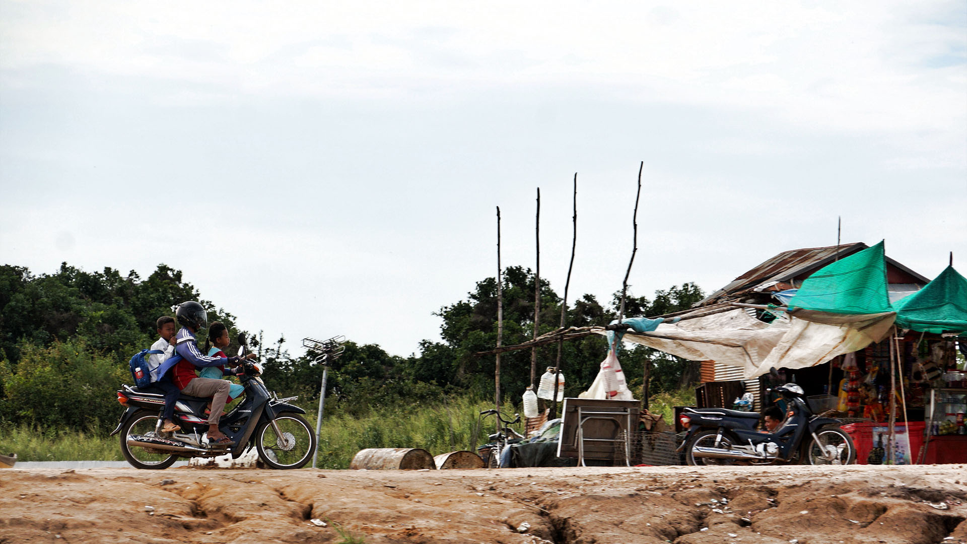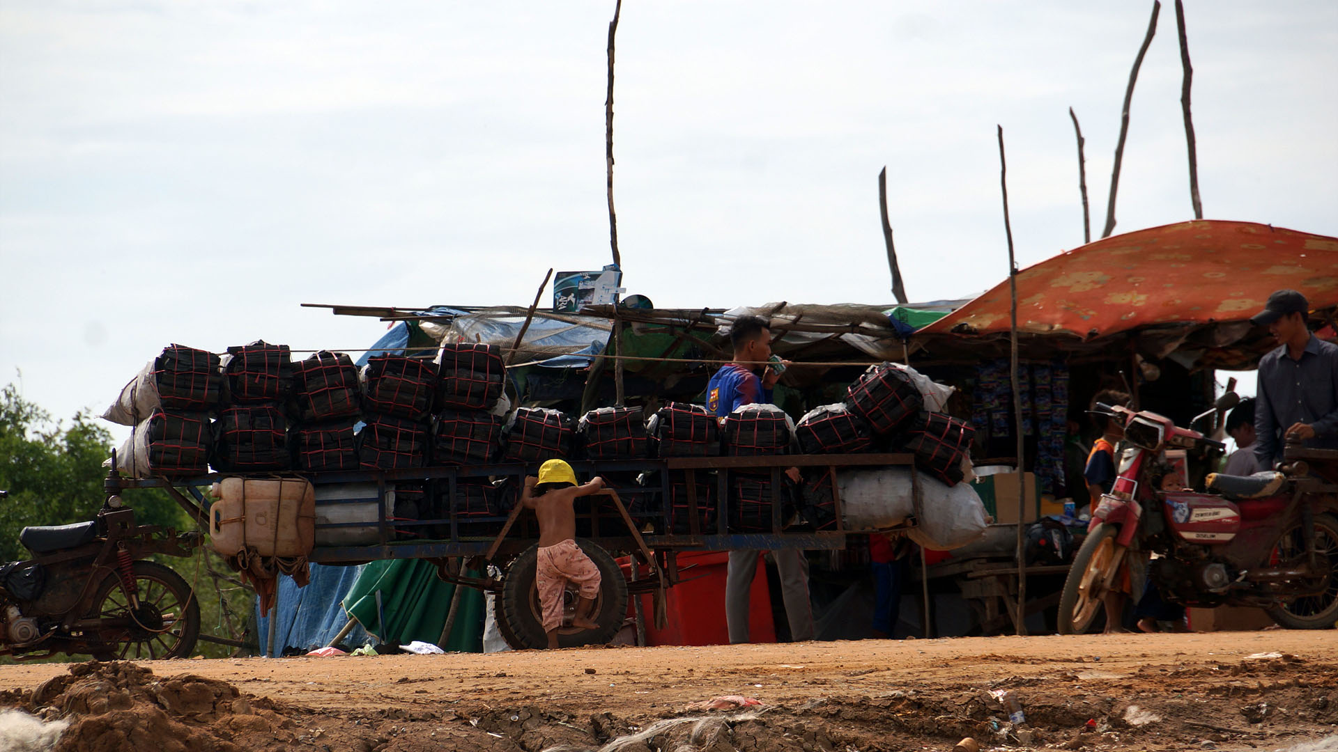 플라스틱 물통을 타고 원달라만 달라고 따라오는 아이들...