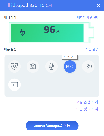 위 설정화면 에서 Lenovo Vantage 도구모음을 켜두면 우측 하단에 배터리 바가 나오고..