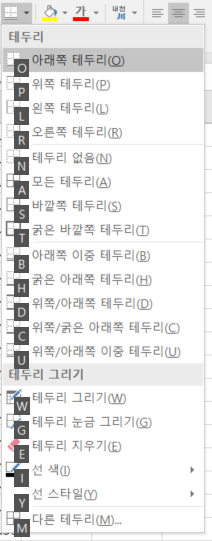 | 16. To add a border 테두리 | Alt + H + B |