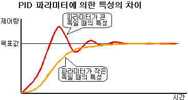 이 파라미터에 범위가 있지만, 이 크기에 의한 차이는 특성의 차이로 나타나며, 아랫 그림과 같이, 파라미터가 많은 경우에는 미분, 적분 효과가 빨리 효력이 나타나므로 아랫 그림의 적색선의 특성과 같이 overshoot이 크게 눈에 띈다. 파라미터가 작은 쪽의 경우는 하측 황색선의 특성과 같이 된다.
