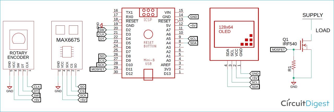 In this project, we use the MAX6675 K-type Thermocouple sensor to read the temperature data from the thermocouple, and in this section, we will explain all the details with the help of the schematic. Let me give you a brief overview of what is happening with this circuit. The MAX6675 is a Cold-Junction-Compensated K- Thermocouple to Digital Converter module and it connects to Arduino according to the schematic. The power is provided to the circuit with the help of a +5V supply of the Arduino. Also to set the temperature and change the modes we are using a generic Rotary encoder if you want to learn more about how rotary encoder works we have a detailed article on how to interface rotary encoder with Arduino. Next, we have the 128X64 OLED display the display shows the temperature data and it also shows the set temperature. If you also want to learn more about OLED display and its interfacing strategies with Arduino there is also a dedicated article on it. As always, we are using Arduino as the brains of the project. By pressing the button on the rotary encoder, we can switch in between two modes one is to set the temperature and another one to monitor the trout from the thermocouple. Other than that, the circuit stays pretty simple.