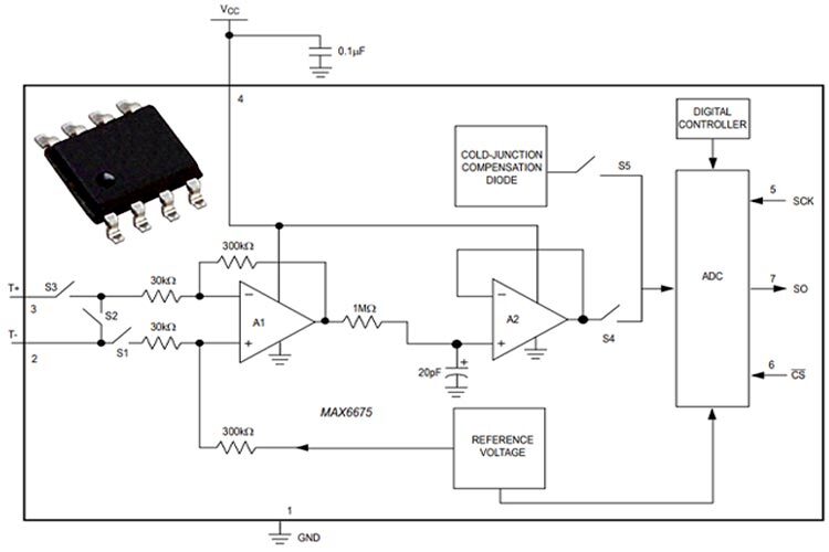 The function of the thermocouple is to sense a difference in temperature between two ends of the thermocouple wires. The thermocouple’s hot junction can be read from 0°C to +1023.75°C. The cold end (ambient temperature of the board on which the MAX6675 is mounted) can only range from -20°C to +85°C. While the temperature at the cold end fluctuates, the MAX6675 continues to accurately sense the temperature difference at the opposite end. The MAX6675 senses and corrects for the changes in the ambient temperature with cold-junction compensation. The device converts the ambient temperature reading into a voltage using a temperature-sensing diode. To make the actual thermocouple temperature measurement, the MAX6675 measures the voltage from the thermocouple’s output and the sensing diode. The device’s internal circuitry passes the diode’s voltage (sensing ambient temperature) and thermocouple voltage (sensing remote temperature minus ambient temperature) to the conversion function stored in the ADC to calculate the thermocouple’s hot-junction temperature. Optimal performance from the MAX6675 is achieved when the thermocouple cold junction and the MAX6675 are at the same temperature. The MAX6675 includes signal-conditioning hardware to convert the thermocouple’s signal into a voltage compatible with the input channels of the ADC. The T+ and T inputs connect to internal circuitry that reduces the introduction of noise errors from the thermocouple wires. More information can be found on the Datasheet of the MAX6675 IC.