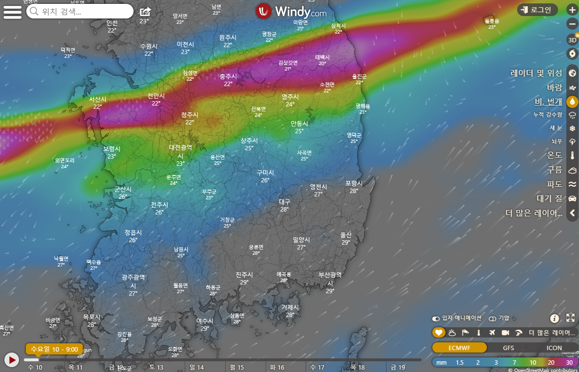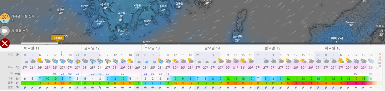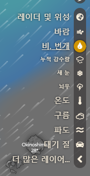 하단 시간 바를 움직이면 대략 일주일정도 날씨를 예상해볼 수 있습니다.