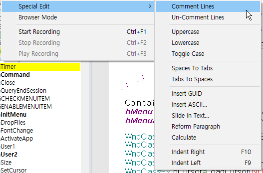 Edit -> Special Edit -> Comment Lines / Un-Comment Lines 선택
