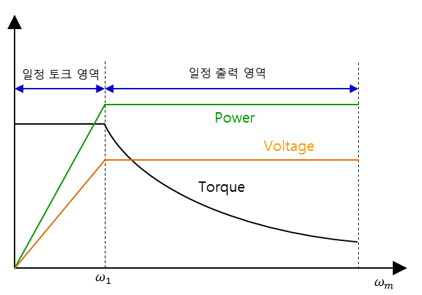 고속의 경우에는 좀 경우가 다른데.. 정토크 영역에서는 V/F가 비례하여 제어되며, 일정 주파수 이상의 영역에서는