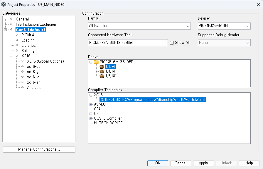 Conf: [default]에서 우측창 Packs와 Compiler Toolchain 선택항목들을 다시한번 선택해주고 Apply누르고 OK눌러준다.