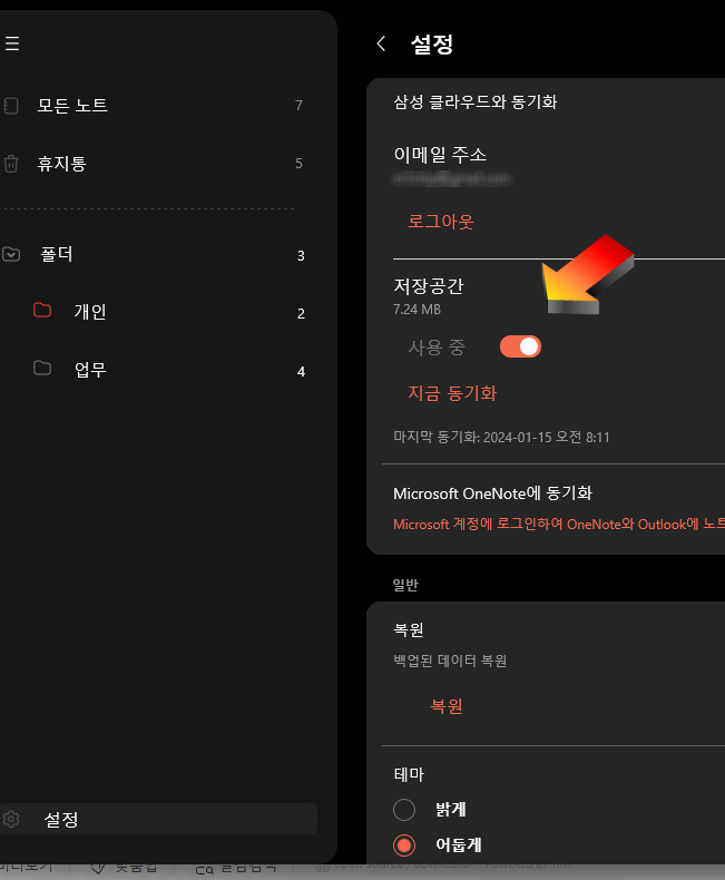 삼성노트 좌측하단의 설정을 누르고.. 저장공간 사용중을 켜주면 됩니다.