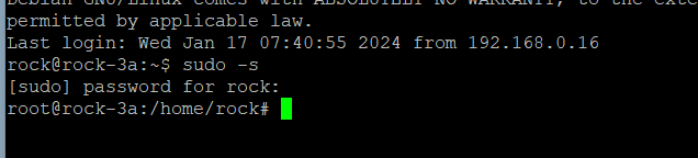 일단 RockPI부팅하면 root권한이 없습니다. 아래와 같이 sudo -s 명령 입력하고 비번 입력하여 root권한 접수하면