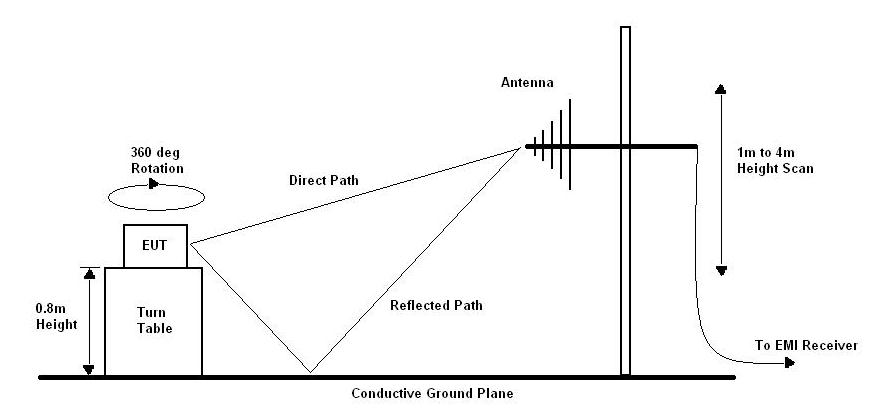 The OATS, as the name implies is an open area with a conductive ground plane on which measurements are made, at the normal test distances of either 3m or 10m between the EUT and the measurement antenna. A typical test setup is shown below: