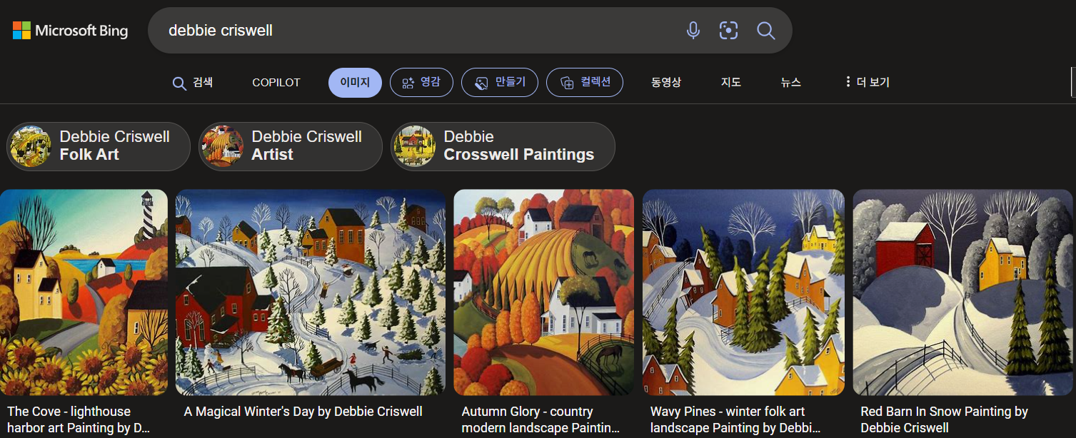 - Debbie Criswell: 미국의 포크 아티스트로, 따뜻하고 편안한 미국의 향수를 불러일으키는 작품을 만듭니다. 그녀의 작품은 주로 목가적인 풍경과 가을 풍경을 주제로 합니다910.