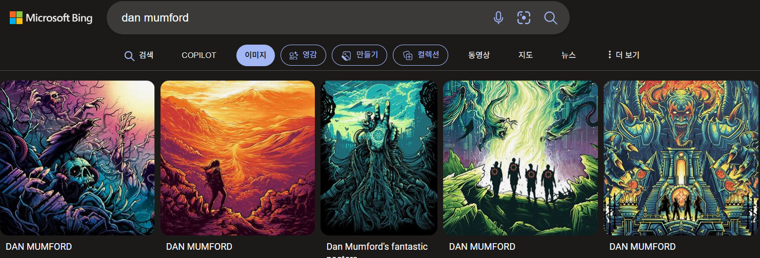 Dan Mumford: 영국의 프리랜서 일러스트레이터로, 팝 문화와 음악 씬에서 활동하며 앨범 커버, 포스터, 게임 아트 등을 만듭니다. 그의 작품은 주로 매직 더 개더링, 던전 앤 드래곤, 스타워즈와 같은 프랜차이즈와 관련이 있습니다34.