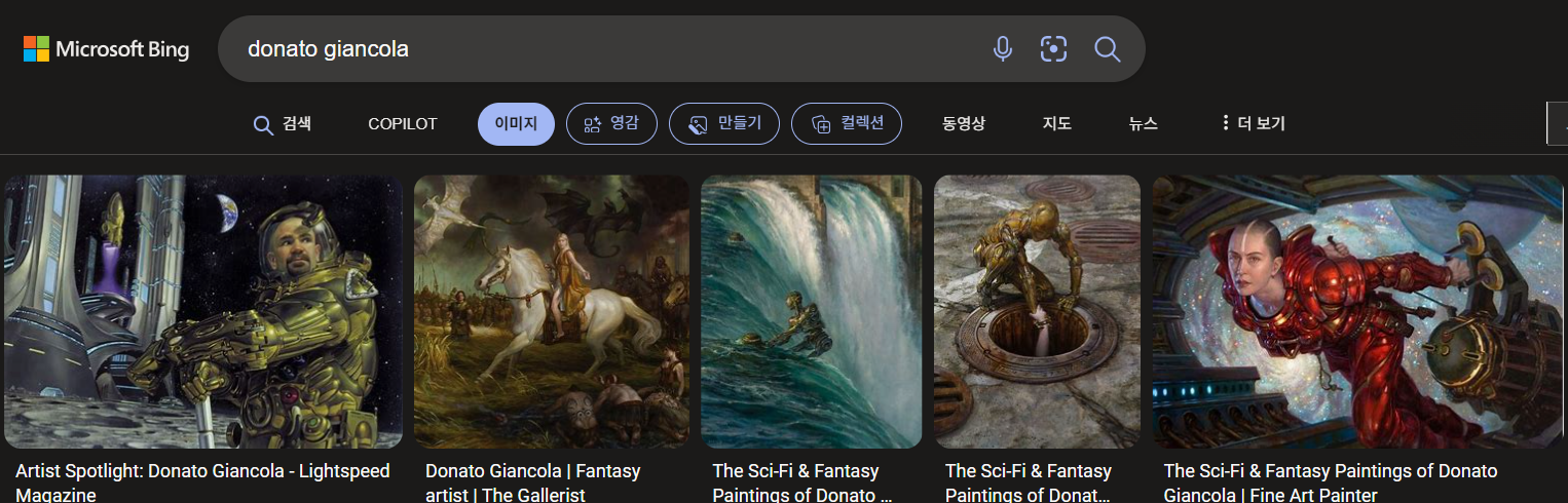 - Donato Giancola: 미국의 화가로, 주로 과학 소설과 판타지 내용을 다루는 내러티브 리얼리즘 작품을 만듭니다. 그는 톨킨의 중간계를 묘사한 작품으로도 유명합니다1314.