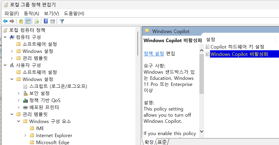 로컬 컴퓨터 정책 > 사용자 구성 > 관리 템플릿 > Windows 구성 요소