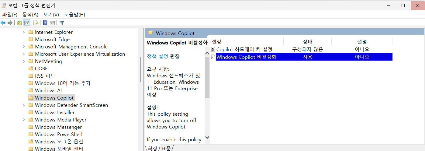 Windows Copilot 을 찾아서 사용으로 바꿨다.