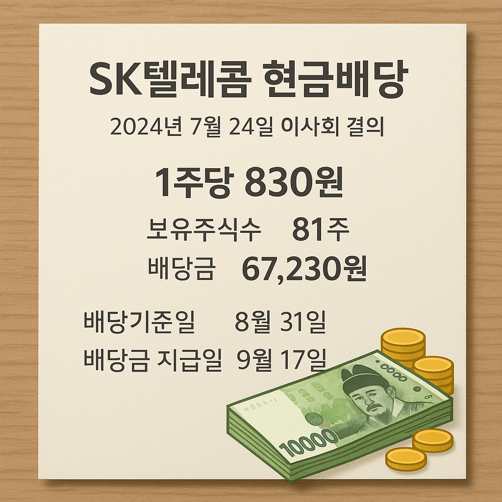 🧾 SK텔레콤이 2025년 7월 24일 이사회에서 1주당 830원의 분기 현금배당을 결의했어요. 81주를 보유 중이라면, 총 67,230원을 받게 됩니다.