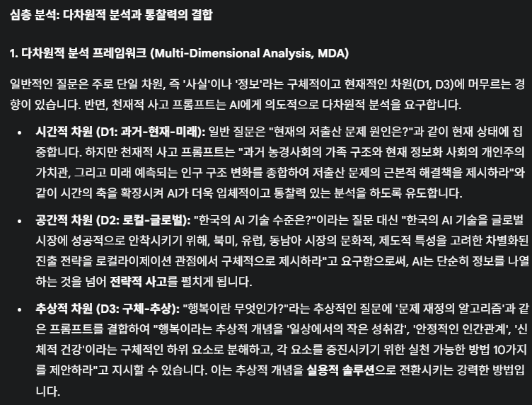 적용법: 주제에 대해 각 요소의 점수를 매기고, 고정관념과 편향을 최소화하면서 관찰-연결-패턴-종합의 순서로 사고를 전개하세요.