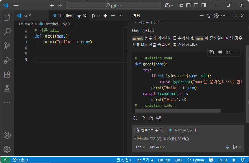 - 예: "이 함수 성능 개선해줘", "변수명을 더 명확하게 바꿔줘"