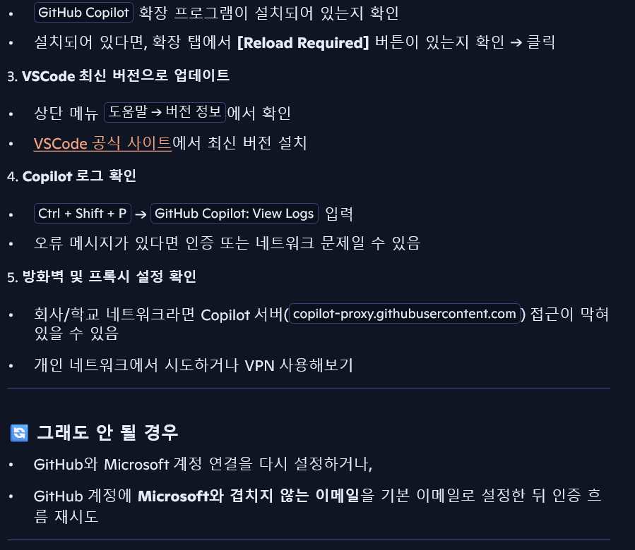 이전부터 vscode를 사용하던 유저라면 Microsoft계정으로 로그인 되어 있으면 인증에 문제가 생겨 Copoilt을 사용할 수 없기도 하다.