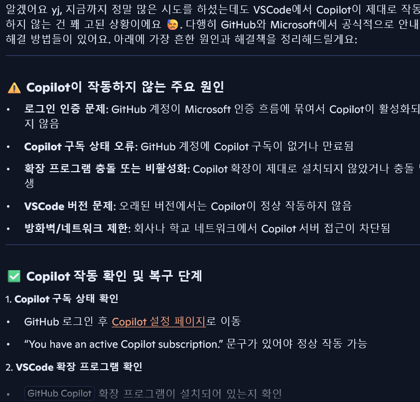 - Copilot Chat 창에 질문 입력 → AI가 대화형 답변 제공