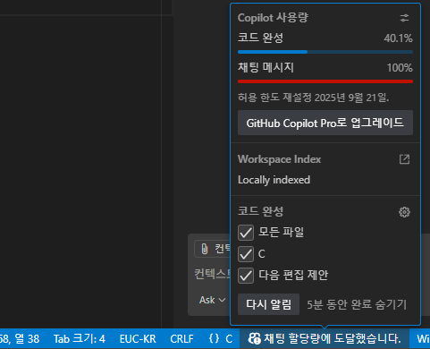 VScode 하단 {}C를 클릭한다음... Completions 를 꺼버리면 자동제안이 되지 않습니다.