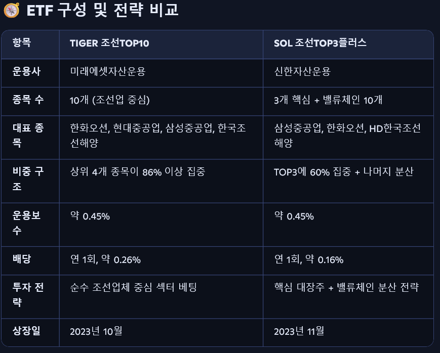 - 분산도: SOL은 기자재 기업 포함해 리스크 완화, TIGER는 순수 조선업 집중