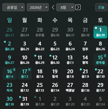 - 8월 15일 광복절 > 대체공휴일 8월 17일 (월)