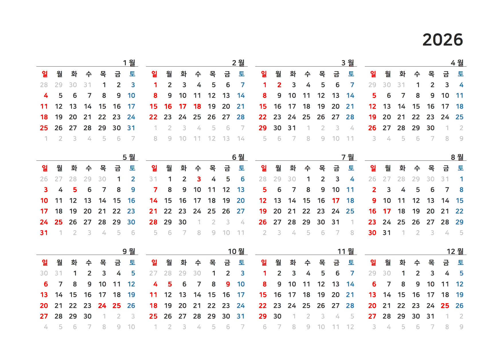 총 공휴일: 71일 (주5일 기준 119일 휴무)주요 공휴일:1월 1일 (신정)2월 16 17일 (설날) > 14(토)~18(수)일 3월 1일 31절 > 대체공휴일 3월 2일5월 5일 (화) 어린이날 2 3 4 5 징검다리 4일 월요일5월 24일 부처님 오신 날 > 5월 25일 (월) 대체 공휴일6월 3일 (지방선거 임시공휴일) (수)7월 17일 (금) 제헌절 17~19일 연휴8월 15일 광복절 > 대체공휴일 8월 17일 (월)9월 30일 (추석 연휴) 목/금/토로 하루 손해보는 느낌10월 3일 개천절 대체 공휴일 10월 5일 (월)12월 25일 (금) 25~27일 연휴